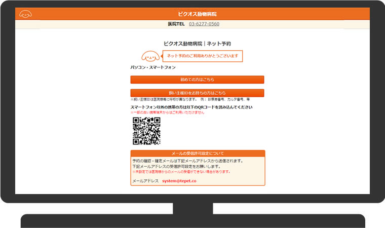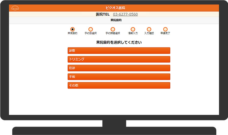 飼い主様が医院様のホームページのリンクボタンをクリックすると、ネット予約のトップ画面が表示されます。