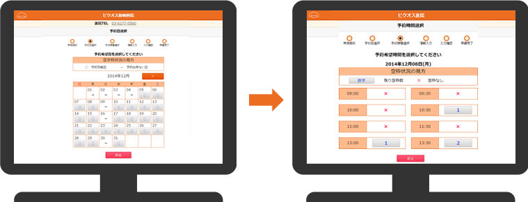 飼い主様は空き時間・休診日を一目で確認し、希望日・希望時間を選択します。