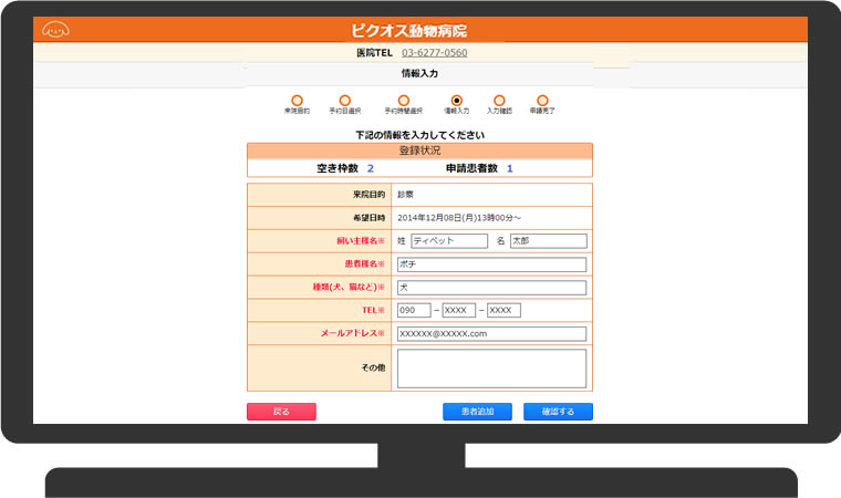 飼い主様は最後に、各情報を入力すれば予約が完了します。